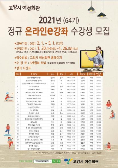 고양시 여성회관은, 언택트 교육환경 변화에 발맞춰 비대면 온라인 교육 서비스를 강화해 2021년 정규 온라인e강좌를 별도로 개설한다. 그리고 다음달 1일 프로그램 시작에 앞서, 오는 20일부터 수강생 5백 명을 모집한다.
