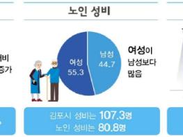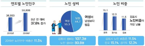 통계에 따르면 김포시 노인 인구는 50,806명이고, 노인 비중은 김포시 전체 인구 대비 11.5%로 경기도 12.3%, 전국 15.1%에 비해 낮은 편이나 관내 노인 인구 비중은 지속적으로 증가세를 보이고 있어 2037년에는 인구 4명 중 1명이 노인이 될 것으로 전망했다.
