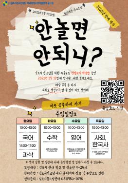 정기수업은 1월 18일부터 12월 10일까지 약 11개월 동안 운영되고, 관내 학교 밖 청소년은 전액 무료로 수강할 수 있다. 운영과목은 국어, 영어, 수학, 과학, 사회, 한국사 6과목이고, 걸포동에 소재한 학교밖청소년지원센터에서 수업을 하고 있으나, 코로나로 인해 휴관 중일 때에는 쌍방향 소통으로 온라인 수업을 진행한다.