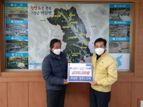 마암면 성전마을 노인회는 1월 13일 마암면사무소를 방문하여 관내 어려운 이웃을 돕는 데 써달라며 성금 30만 원을 기탁했다.