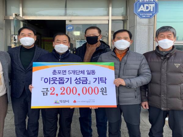 춘포면 5개 단체는 14일 행정복지센터를 찾아 이웃돕기 성금 220만원을 전달했다.