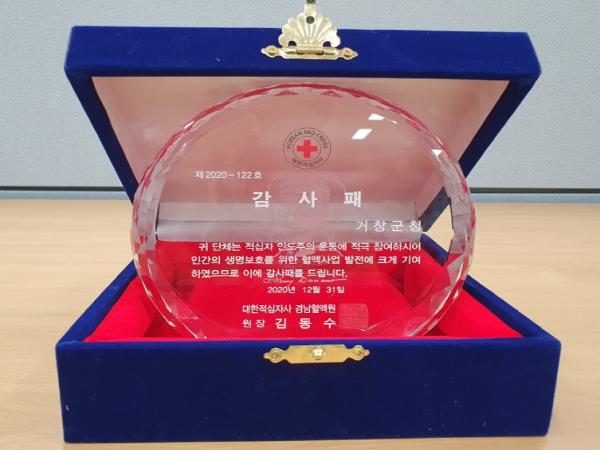 코로나19로 인한 혈액부족 문제 해결을 위해 지난해 11월 20일부터 12월 20일까지 열린 이번 헌혈캠페인은 거창군민 74명이 사랑 나눔에 참여한 결과, 경남도 내 헌혈 참여율이 높은 단체로 선정되어 감사패와 ‘봉사상’을 수상하는 영예를 안았다.
