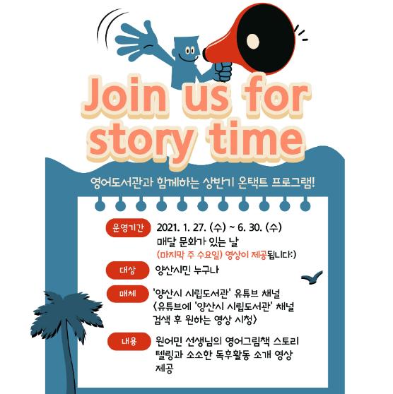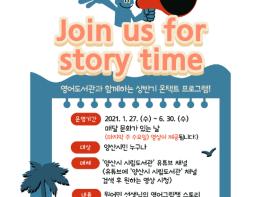 양산시립 영어도서관은 상반기 온택트 프로그램으로 원어민선생님의 영어그림책 스토리텔링 영상을 제공하는 ‘Join us for storytime’을 1월 27일부터 6월 30일까지 운영한다.