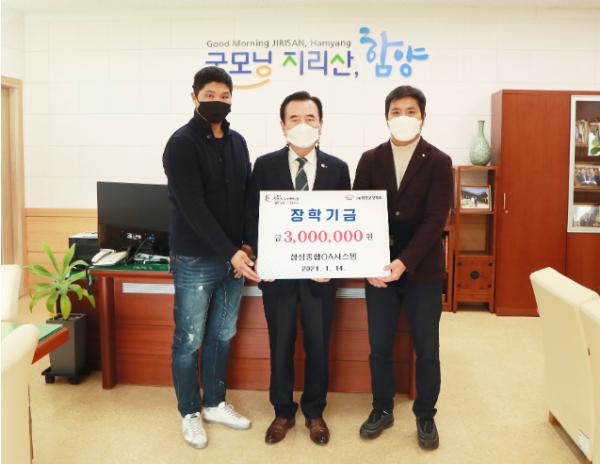 (사)함양군장학회는 14일 통신, 사무기기 업체인 삼성종합OA시스템으로부터 장학금 300만원을 기탁받았다고 밝혔다.