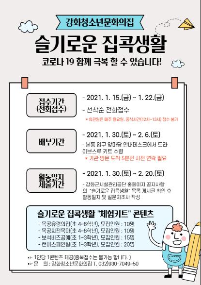 강화군시설관리공단(이사장 한기량)에서 운영하는 청소년문화의집은 오는 1월 15일부터 22일까지 겨울방학특강 프로그램 ‘슬기로운 집콕생활 체험키트’ 참여자를 모집한다.