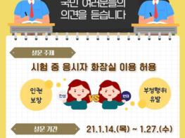 이번 국민 의견조사의 주요 내용은 ▲ 시험 중 응시자의 화장실 이용 허용 여부 ▲ 시험 중 화장실 이용 방법 ▲ 과민성 대장(방광)증후군 질환자, 임신부 편의제공 허용여부 등으로 구성했다.