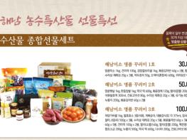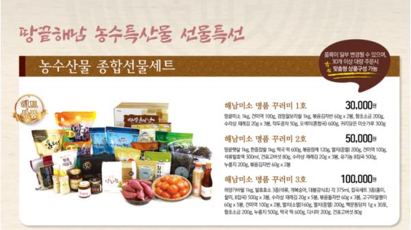 땅끝해남 농수특산물 선물특선으로 명품꾸러미 선물 3종, 천혜의 자연환경에서 생산되는 청정 쌀과 잡곡 15종, 축산물 8종, 수산물 20종, 전통식품 13종, 웰빙 과일채소 25종, 건강식품 19종 등 총 100여개 명절 선물을 선보이게 된다.