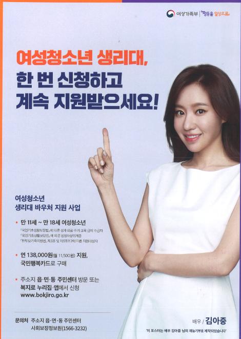 여성청소년 보건위생물품 지원사업은 2018년 생리대를 현물로 지원하던 사업에서 지원받는 여성 청소년의 편의성과 정서적 불편함을 해소하기 위해 2019년부터 바우처를 지원하는 사업으로 변경되어 운영되고 있다.