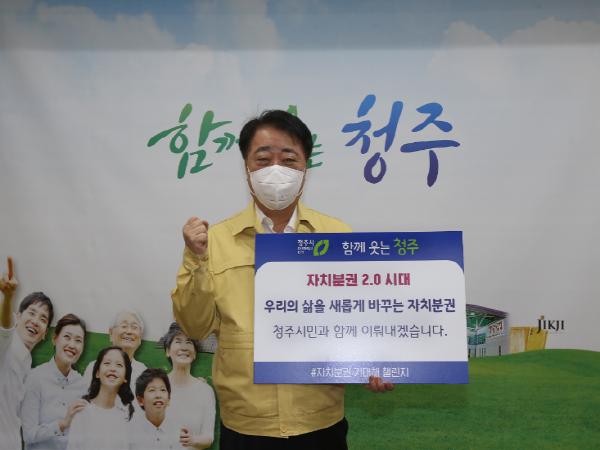 한범덕 청주시장은 “자치분권 2.0시대는 주민 중심으로 새로운 미래를 향한 지방자치의 개막이며, 청주시민과 함께 이뤄 나아가겠다”라고 말하며 다음 챌린지 참여자로 이장섭 국회의원과 최충진 청주시의장을 각각 지명했다.