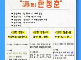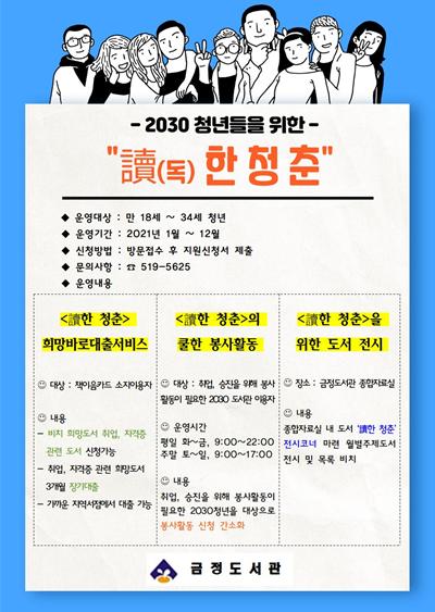 부산 금정구 금정도서관에서는 지역 청년(만 18~34세)들을 위한 맞춤형 서비스인 『2030 청년들을 위한 讀(독)한청춘』을 1월부터 운영한다.