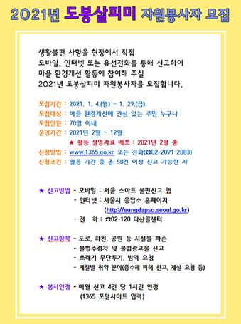 도봉구는 주민이 직접 동네 불편사항을 찾아 신고하여, 살기좋은 지역사회를 만드는 데 일조하는 자원봉사자 ‘도봉살피미’를 새롭게 모집하고 있다.
