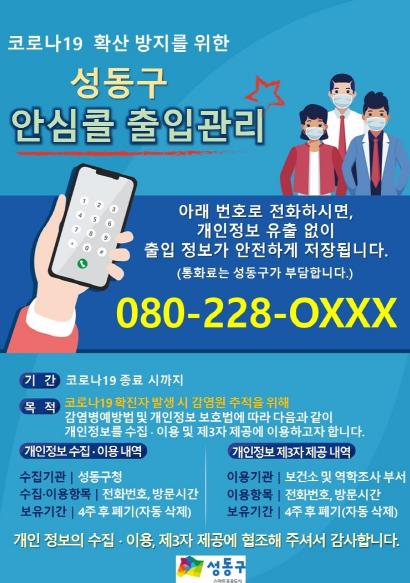 구는 지난 달 24일부터 올해 1월 8일까지 성동구청사 1층 출입구와 지하1층 출입구에 통화 한 번으로 전자출입명부를 대체할 수 있는 안심콜 출입관리 서비스를 임시 운영하였다.