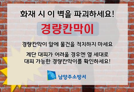 남양주소방서 관계자는 “화재로 계단을 통한 대피가 어려울때 경량칸막이는 생명의 길이 될 수 있으니 각 가정에서는 경량칸막이 시설이 있는지 꼭 확인하고, 긴급상황에서 사용할 수 있도록 관리해야 한다.”고 당부했다.