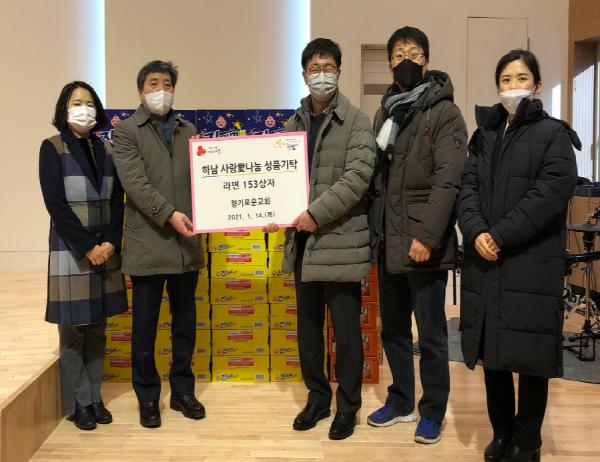 하남시 신장동에 위치한 향기로운 교회가 지난 14일 이웃돕기 성품으로 140만원 상당의 라면 153상자를 하남시에 기탁했다.