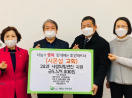 평택복지재단 산하 팽성노인복지관은 13일 팽성읍 안정리에 위치한 ‘시온성교회’와 후원금 전달식을 가졌다. 이날 전달된 후원금은 2020년 연말을 맞아 시온성교회의 교인들이 직접 모은 성금으로 2021년 한 해 동안 팽성읍 취약계층 어르신들에게 밑반찬으로 전달해드릴 예정이다.