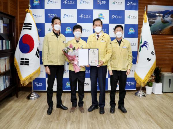 정구훈 주무관은 공중화장실 환경개선을 통한 옥천군 이미지제고 등 안전하고 편리한 공중화장실 문화를 기여하는 등 군민편의증진에 노력한 공이 인정되었다.