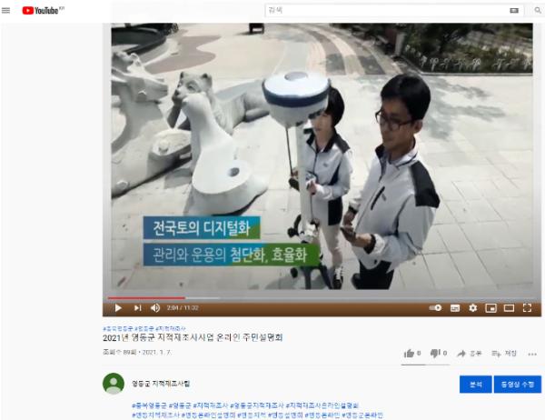 군은 온라인 주민설명회 안내문을 지난 8일 우편으로 개별통지 했으며, 영동군 지적재조사팀 유튜브에 설명회 영상을 게시하였다.