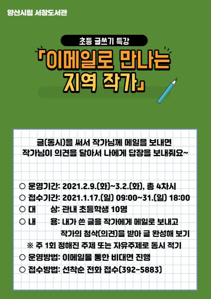 양산시립 서창도서관은 글쓰기 특강 ‘이메일로 만나는 지역작가’을 운영한다.