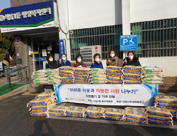 인천 서구 석남1동 통장자율회(회장 오명화)는 지난 14일 십시일반 모은 성금으로 저소득 가정 70가구에 쌀 70포를 전달했다고 15일 밝혔다.
