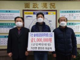서천군 기산솔바람공동체후원회는 15일 기산면 영모리 주민 이승덕 씨가 새해를 맞아 코로나19로 어려움을 겪고 있는 이웃을 위해 사용해 달라며 후원금 100만 원을 기부했다고 밝혔다.