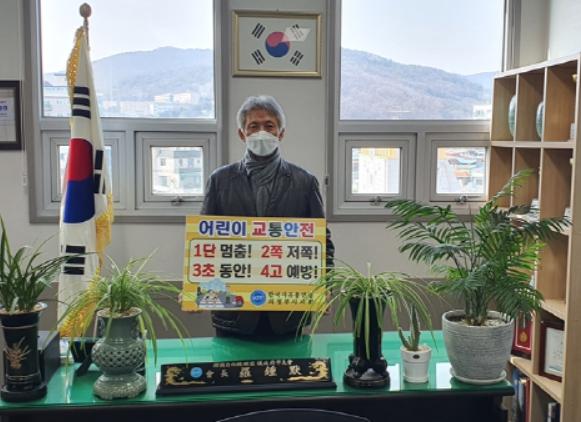 나종묵 회장은 ‘1단 멈춤, 2쪽 저쪽, 3초 동안, 4고 예방’ 푯말을 들고 어린이 보호구역 내 실천 메시지를 전달했다.