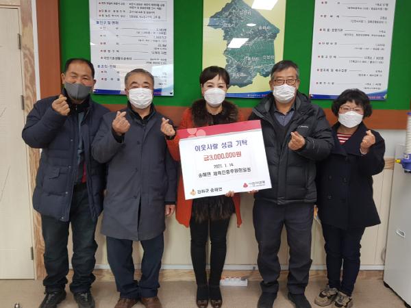 강화군 송해면 체육진흥후원회(회장 장석찬)가 지난 14일 민족 고유의 명절 설을 맞아 코로나19로 어려워하는 이웃을 돕기 위한 성금 300만 원을 송해면에 기탁했다.