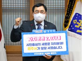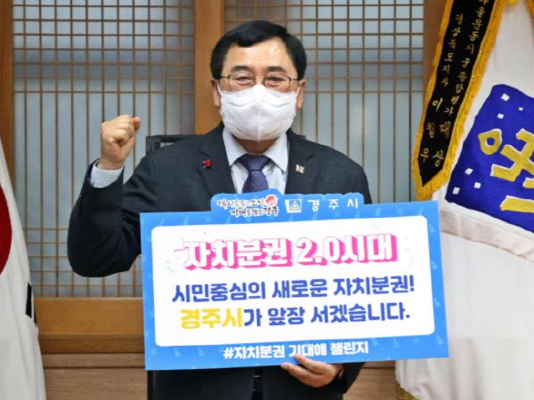 경주시는 주낙영 시장이 자치분권 2.0시대 개막을 응원하기 위해 진행 중인 ‘자치분권 기대해’ 챌린지에 동참했다고 15일 밝혔다.