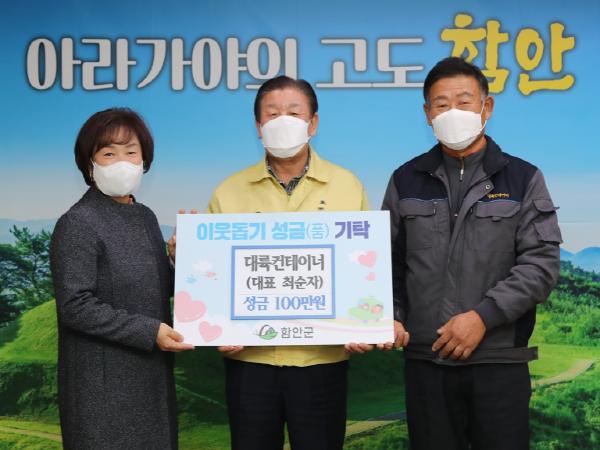 대륙컨테이너는 지난 14일 오후3시, 군청을 방문하여 관내 취약계층을 위해 사용해달라며 성금 100만 원을 기탁했다.