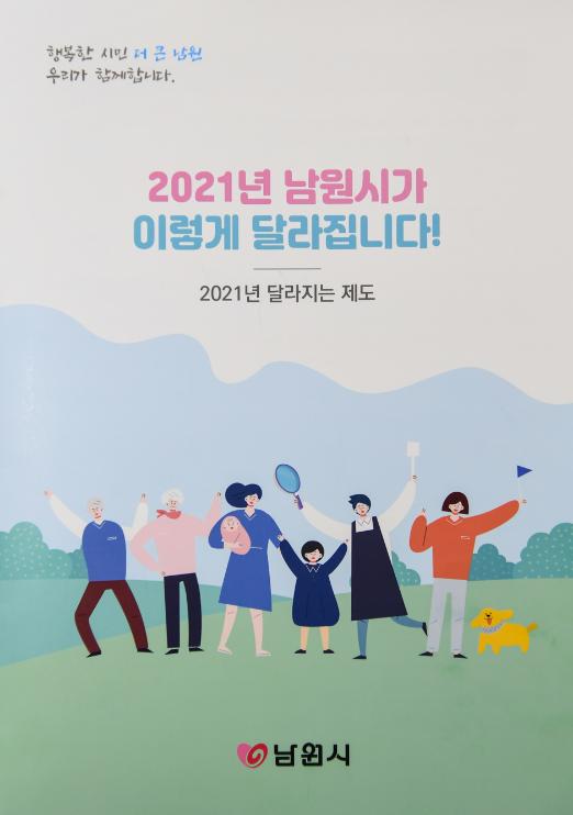 남원시는 2021년 새해를 맞아 시민들이 알아야 할 유익한 정보를 담은 ‘2021년 남원시가 이렇게 달라집니다’책자를 발간했다고 밝혔다. 이번에 발간한 책자는 제도적으로 변경된 사항과 시민들의 실생활에 유용한 정보를 간략하게 제공하고 있으며, 세제·부동산, 재난·안전, 농·축산·식품, 문화·관광·교육·체육, 복지·여성·보건, 건설·교통, 경제·산업, 환경·녹지, 일반행정 등 9개 분야 49개 내용으로 구성되었다. 9개 분야 주요 내용은 다음과 같다.