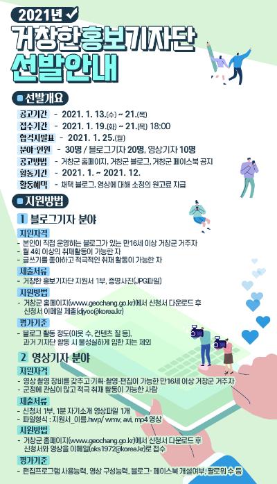 지원자격은 거창군에 거주하는 만 16세 이상으로 블로그기자 분야는 월 4회 이상 취재활동이 가능해야 하고, 영상기자 분야는 영상촬영 장비를 갖추고 영상기획?촬영?편집이 가능하면 누구나 지원할 수 있다.