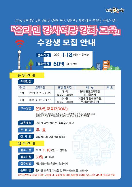 이번 교육은 관내 평생학습기관 및 주민자치센터, 방과 후 강사 등 강의 활동에 있어 온라인교육 기능을 필요로 하는 강사이면 누구나 신청 가능하고, 오늘 18일(월)부터 거창군 평생교육센터 홈페이지를 통해 접수할 수 있다.