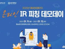 충남창조경제혁신센터와 호서대학교 창업지원단은 이달 11일부터 12일까지 이틀간 우수 아이디어를 가진 지역 중소·벤처 및 초기 창업기업에게 투자유치 기회 제공을 위한 ‘온라인 IR피칭 데모데이’를 성공적으로 마무리했다.