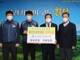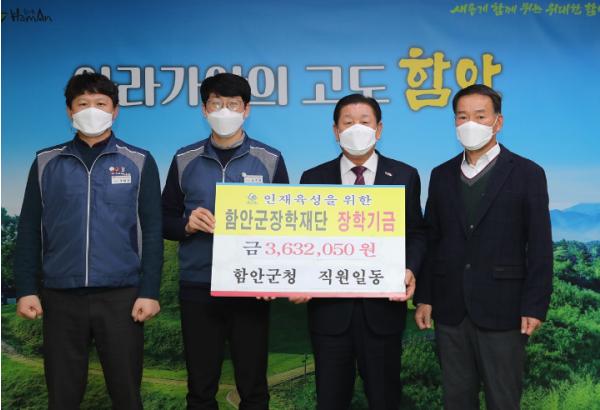 함안군 조주환 노조지부장은 지난 15일 군청 직원을 대표하여 미래 인재양성을 위한 장학기금 363만 2,050원을 군 장학재단에 기탁했다.