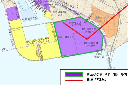구체적으로 철도 건설 부지(항만시설용부지(지원시설) 251만3,000㎡, 항만배후단지 444만9,000㎡) 총 696만2,000㎡에 대한 세부 매립계획이 담겼으며, 접근성 제고를 위한 배후수송망의 조기 확충, 철도인입 시설의 위치와 개발 시기 확정 추진 등 철도 인입의 필요성이 충분히 반영됐다.