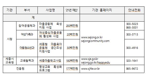세종특별자치시와 세종특별자치시교육청, 세종시인재육평생교육진흥원(원장 임각철)이 오는 18일부터 2021년 공동체 지원사업 통합설명회를 온라인으로 개최한다.