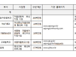 올해 공모사업은 ‘세종형 마을육아공동체 공간조성 지원사업’이 추가돼 ▲마을공동체 육성지원 사업 ▲여성중심마을공동체 활성화 사업 ▲세종마을학교사업 ▲평생교육 특성화 프로그램 등으로 진행된다.