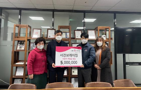 시흥시 서경브레이징(대표 신영식)은 15일 신천동 지역사회보장협의체(공공위원장 김병철, 민간위원장 정미순) ‘행복마을’에 후원금 300만원, ‘복지세상미래’에 200만원, 총 500만원을 지정 기탁했다.
