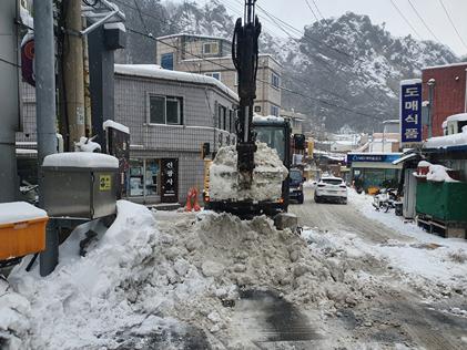 울릉군은 제설차 진입이 어려운 시가지 제설을 위해 경상북도에 민간장비 투입비 및 제설자재 구입비를 건의하여 1월 6일 도비 1억원을 확보하였고, 1월 9일부터 민간장비(일최대 굴삭기21대, 트럭12대 등)를 투입해 제설작업에 최선의 노력을 다하고 있다.