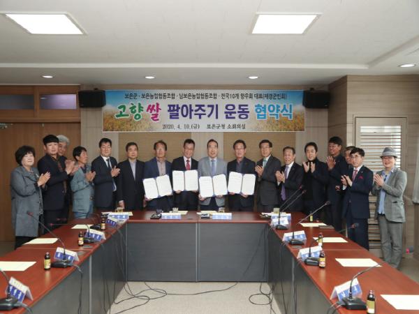 지난해 4월 보은군수와 곽덕일 보은농협조합장, 박순태 남보은농협조합장, 전국 10개 도시 보은향우회 대표로 참석한 정영기 재경보은군민회장이 고향 쌀 팔아주기 운동 협약을 맺고 보은에서 생산되는 찰지고 맛좋은 “삼광쌀”팔아주기에 나섰다.