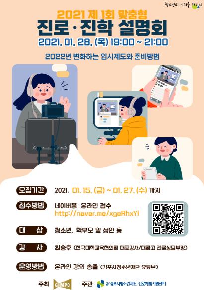 제1회 설명회는 다가오는 1월 28일(목) 예정되어 있으며 ‘2022년도 변화하는 입시제도와 준비전략’을 주제로 한국대학교육협의회 소속 최승후 대표강사를 모시고 진행한다. 코로나-19 상황에 따라 전년에 이어 비대면 설명회 방식으로 운영하며 설명회 영상은 김포시청소년재단 유튜브를 통해 당일 19시부터 송출될 예정이다.