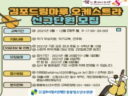 (재)김포시청소년재단 김포중봉청소년수련관은 김포드림마루 오케스트라 신규단원을 오는 1월 20일부터 모집한다고 밝혔다.