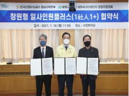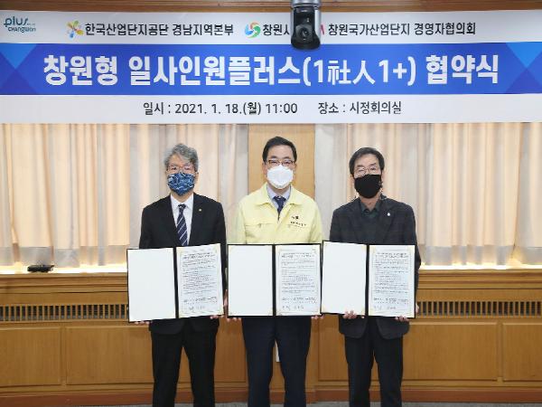 창원시는 18일 오전 11시 시정회의실에서 ‘일자리 걱정 없는 창원’ 실현을 위해 한국산업단지공단 경남지역본부, 창원국가산업단지 경영자협의회와 ‘일사인원플러스(1社人1 )’ 업무협약을 체결했다고 밝혔다.