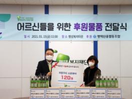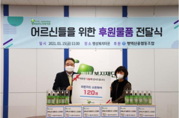 평택시 복지재단 산하기관 평택북부노인복지관은 1월15일 평택신용협동조합으로부터 어르신들의 건강과 쾌적한 환경을 위하여 편백 피톤치드 스프레이 120개를 후원받았다.