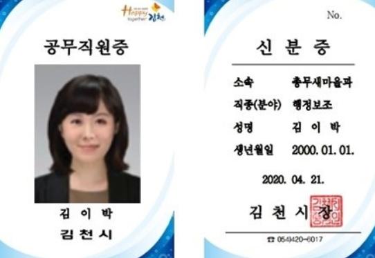 이에 김천시는 「김천시 공무직근로자 및 기간제근로자 인사관리규정」에 통일된 공무직원증의 디자인을 명시하였으며, 이에 따라 새로운 공무직원증을 제작하여 김천시 소속 전 공무직근로자에게 배부하였다.