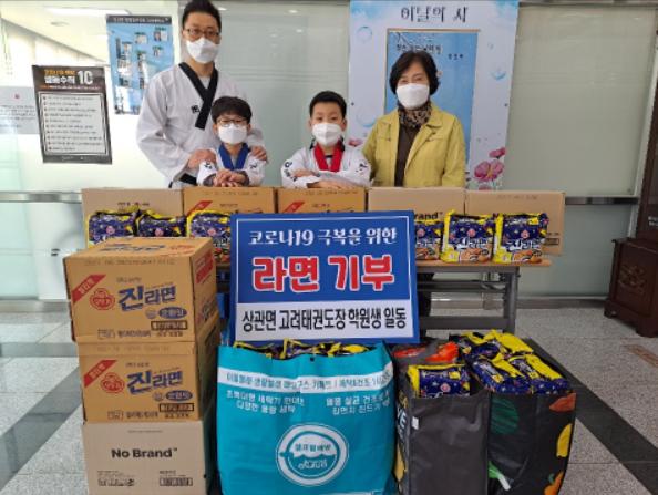18일 상관면에 따르면 관내 소재한 고려태권도 원생들이 코로나19로 어려움이 큰 이웃들을 위해 십시일반 라면을 모아 기부했다.