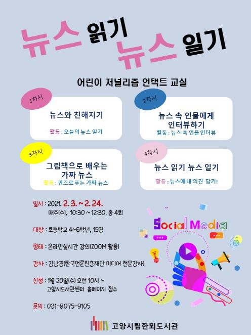 고양시 한뫼도서관이 겨울방학을 맞은 초등학생들을 대상으로 어린이 저널리즘 언택트 교실 ‘뉴스 읽기, 뉴스 일기’를 운영한다.