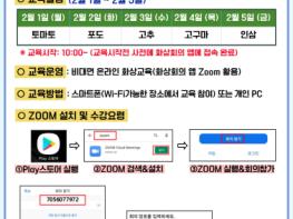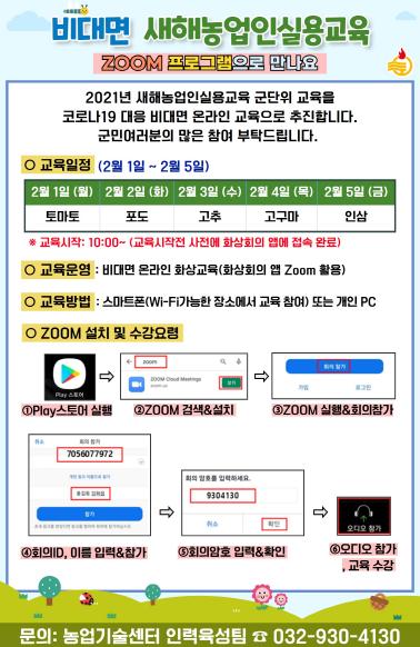 품목별 교육일정은 ▲토마토(2월 1일) ▲포도(2월 2일) ▲고추(2월 3일) ▲고구마(2월 4일) ▲인삼(2월 5일)으로 교육을 희망하는 농업인은 비대면 화상회의(ZOOM) 앱을 활용해 스마트폰 또는 개인 PC를 통해 수강할 수 있다. 당일 오전 10시부터 교육이 시작되므로 교육 시작 전에 화상회의((ZOOM) 앱에 접속해야 한다