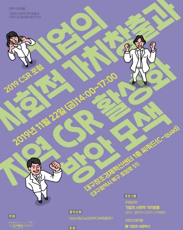 대구시 시민공익활동지원센터는 대구지속가능발전협의회, 대구 시에스아르(CSR) 네트워크와 함께 영역 간 소통을 통해 기업의 사회공헌활동에 대한 인식 제고를 위해 ‘2019 CSR 포럼’을 개최한다.
