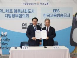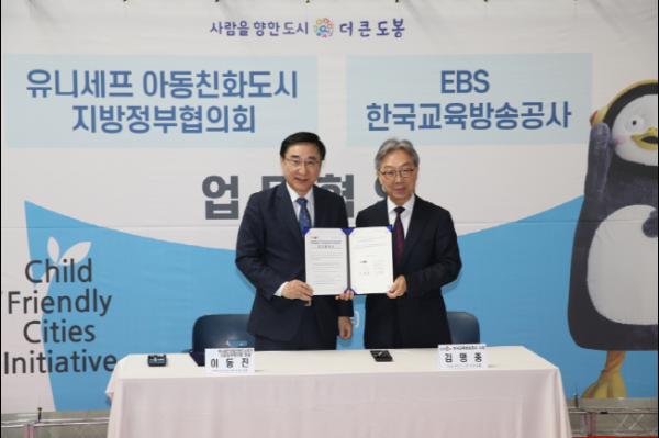 유니세프 아동친화도시 추진 지방정부협의회(회장 이동진 도봉구청장)는 11월 20일 도봉구청에서 한국교육방송공사(이하 EBS, 사장 김명중)와 아동의 인권보호 및 권리실현을 위한 공동협력 양해각서를 체결하고, 상호 협력 방안을 추진하는데 합의했다.