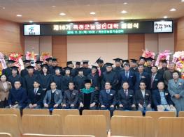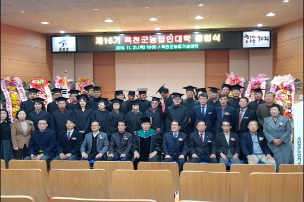 옥천군농업기술센터(소장 이재실)에서는 옥천군농업인대학장 김재종 군수를 비롯해 농업인대학 졸업생, 가족, 내빈 등 150여 명이 참석한 가운데 21일 농업기술센터 농업인교육관에서 제16기 옥천군농업인대학 졸업식을 가졌다.